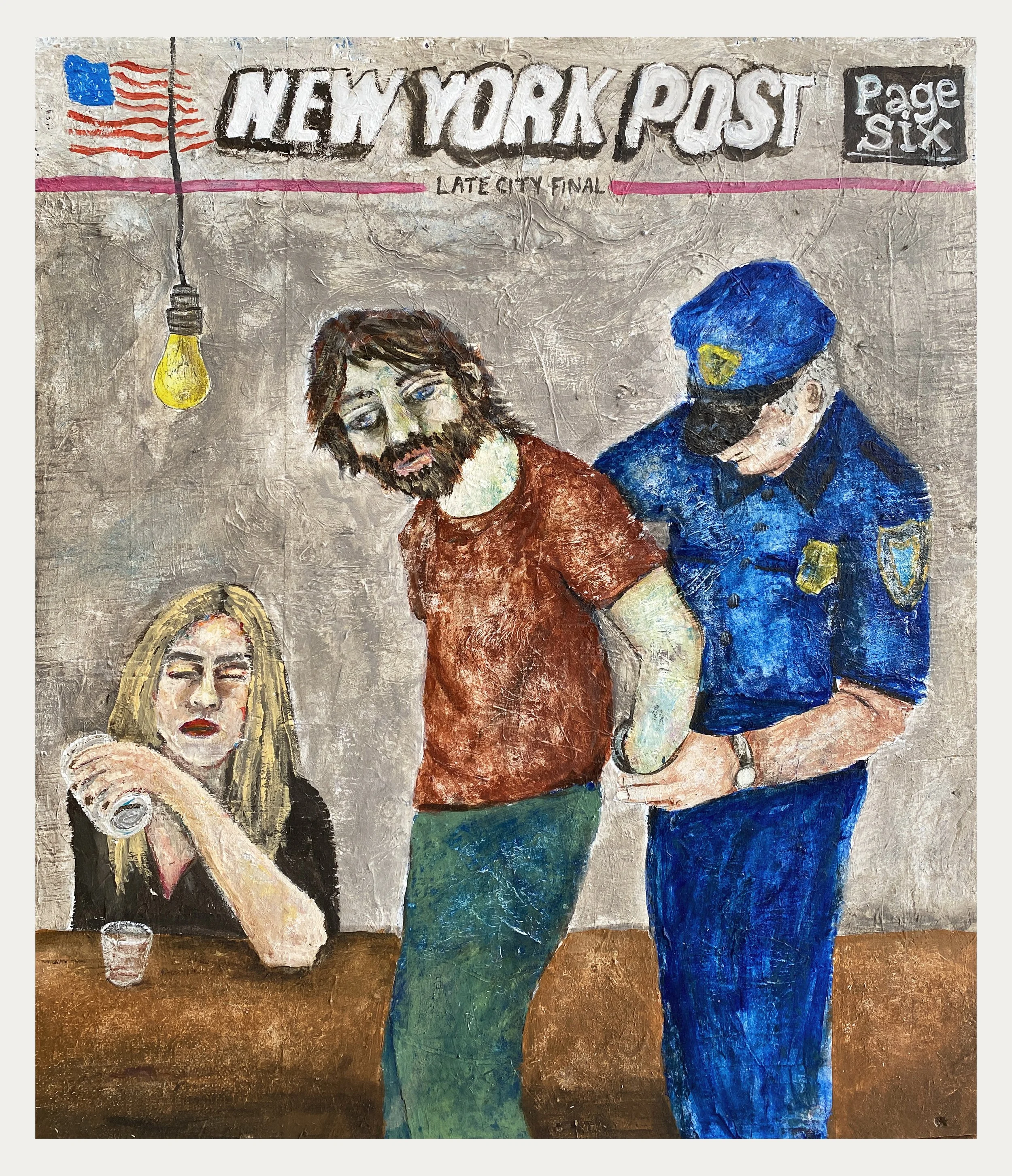 Self Portrait Arrested on Spring Street, Acrylic on Wood Salvaged from a Dismantled Covid Dining Shed in Brooklyn, 28x32 inches, 2022